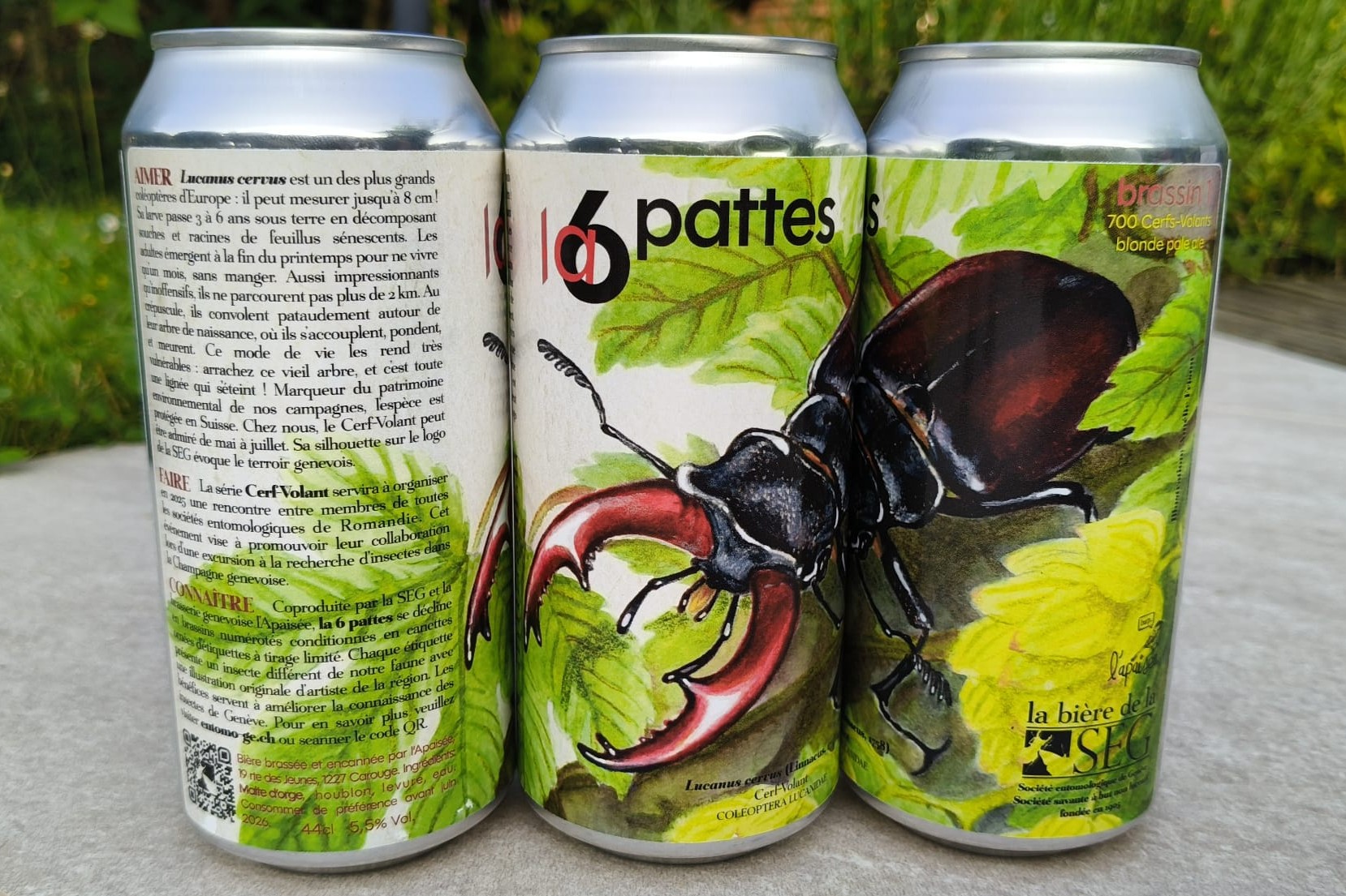 Elle est le fruit d’un partenariat entre la SEG et la brasserie genevoise l’Apaisée. La 6 pattes se décline en brassins numérotés conditionnés en canettes aluminium de 44 cl, ornées d’étiquettes à tirage limité. Chaque étiquette présente un insecte différent de notre faune avec une illustration originale d’artiste de la région, ainsi que l’action que la SEG escompte financer avec ses bénéfices.